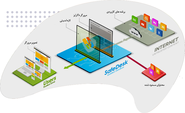 جداساز اینترنت مبتنی بر VDI کانتینری، محیطی ایزوله و امن برای مرور وب و دسترسی به اینترنت فراهم می‌کند. این محصول با بهره‌گیری از فناوری داکر و کوبرنتیز، مدیریت متمرکز، امنیت پیشرفته و مقیاس‌پذیری پویا را برای سازمان‌ها تضمین می‌کند.